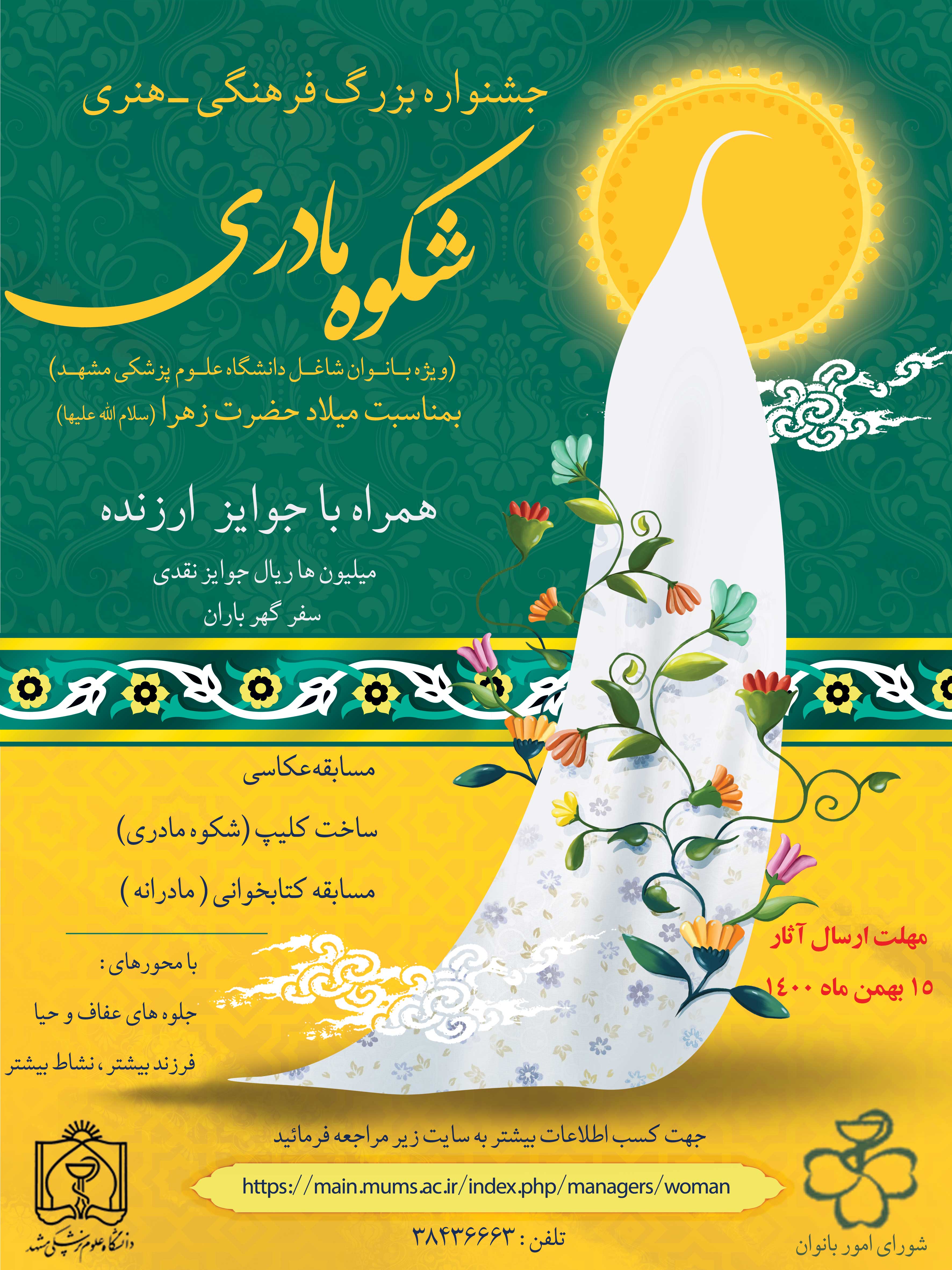 به مناسبت ولادت یگانه دخت نبی اکرم (ص ) و روز زن ، شورای امور بانوان دانشگاه مشهد اولین جشنواره فرهنگی – هنری «شکوه مادری» را با هدف تقویت جلوه های عفاف و حیا و رویکرد فرزندآوری ، برگزار می نماید.