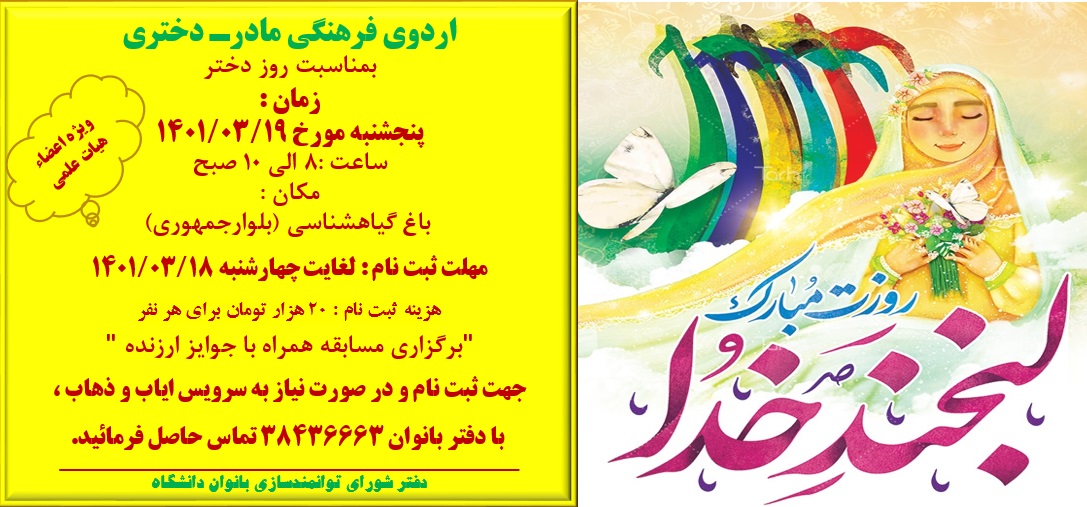 19 خرداد 1401 24 مرداد 1401 بازدید: 85 امتیاز: ( 0 Rating ) اردوی فرهنگی مادر - دختری بمناسبت روز دختر امتیاز کاربران لطفا رای دهید رای 1 رای 2 رای 3 رای 4 رای 5 دفتر شورای بانوان دانشگاه بمناسبت روز دختر اردوی یک روزه فرهنگی مادر - دختری را در مورخ 19/ 03/ 1401 ویژه اعضاء هیات علمی و کارکنان در باغ گیاهشناسی (بلوار جمهوری) برگزار نمود. قبلی بعدی