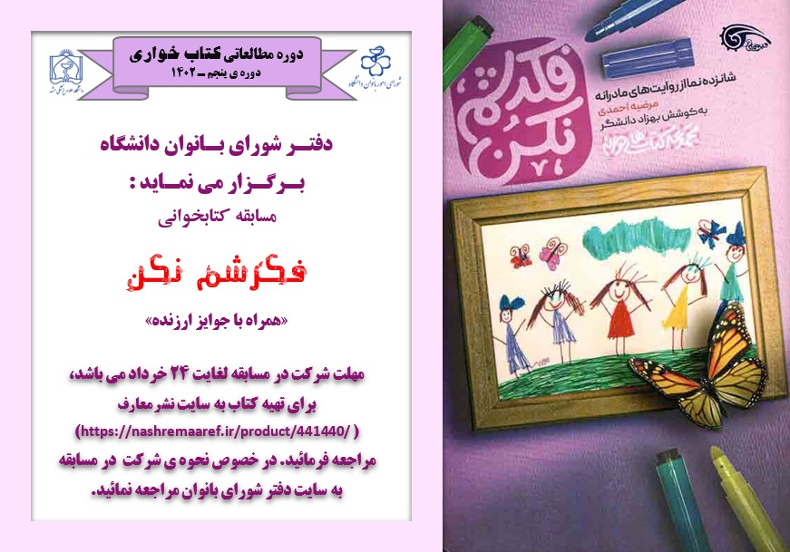 قابل توجه کلیه همکاران خانم دانشگاه ، در ادامه دوره مطالعاتی کتاب خواری به مناسبت هفته ی جمعیت مسابقه کتابخوانی با عنوان « فکرشم نکن » که شامل روایت های مادرانه می باشد ، برگزار خواهد شد.