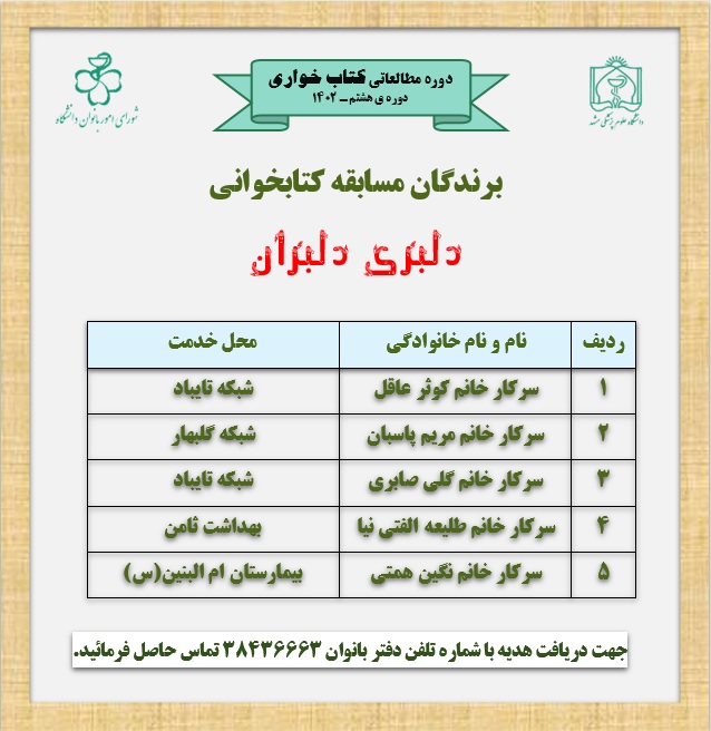 26 اسفند 1402 26 اسفند 1402 بازدید: 103 امتیاز: ( 0 Rating ) اعلام برندگان مسابقه کتابخوانی " دلبری دلبران" امتیاز کاربران لطفا رای دهید رای 1 رای 2 رای 3 رای 4 رای 5 قبلی بعدی