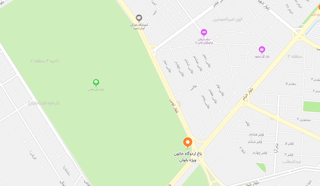 آدرس اردوگاه باغ خاتون : مشهد - تقاطع بلوار خیام و توس - باغ اردوگاه خاتون