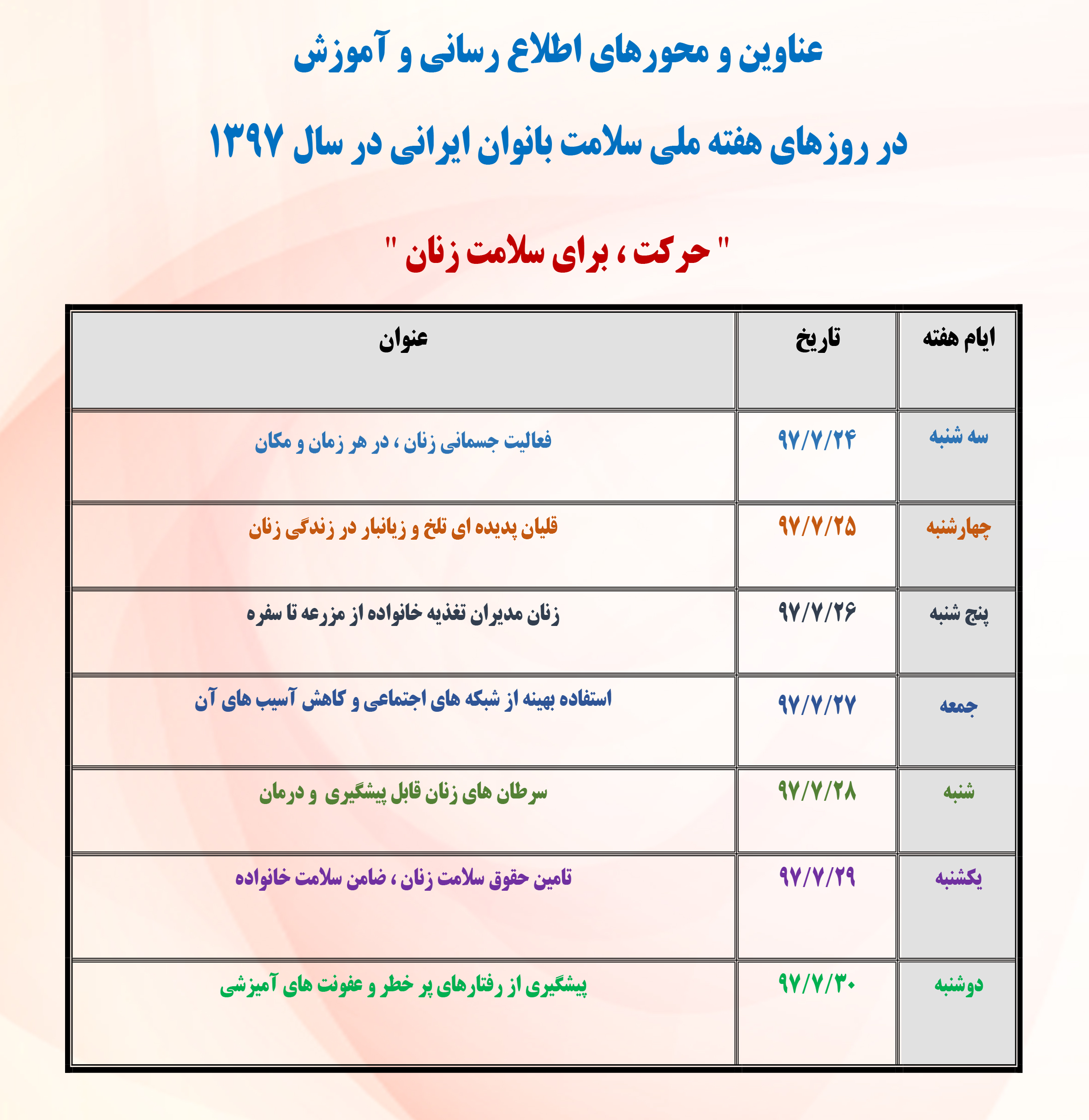 17 مهر 1397 25 اسفند 1398 بازدید: 742 امتیاز: ( 0 Rating ) عناوین و محورهای اطلاع رسانی و آموزش در روزهای هفته ملی سلامت بانوان ایرانی در سال 1397 امتیاز کاربران لطفا رای دهید رای 1 رای 2 رای 3 رای 4 رای 5 قبلی بعدی
